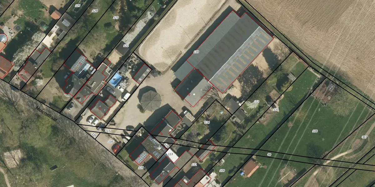 Het perceel waarop Molenstraat 57-B staat heeft een oppervlakte van 4540 m². Dit is een zeer groot perceel. De perceeloppervlakte wordt geregistreerd door het Kadaster. Gedetailleerde informatie over de maten van dit perceel kunt u vinden in het rapport Kadastrale kaart met maatvoering van Molenstraat 57-B.