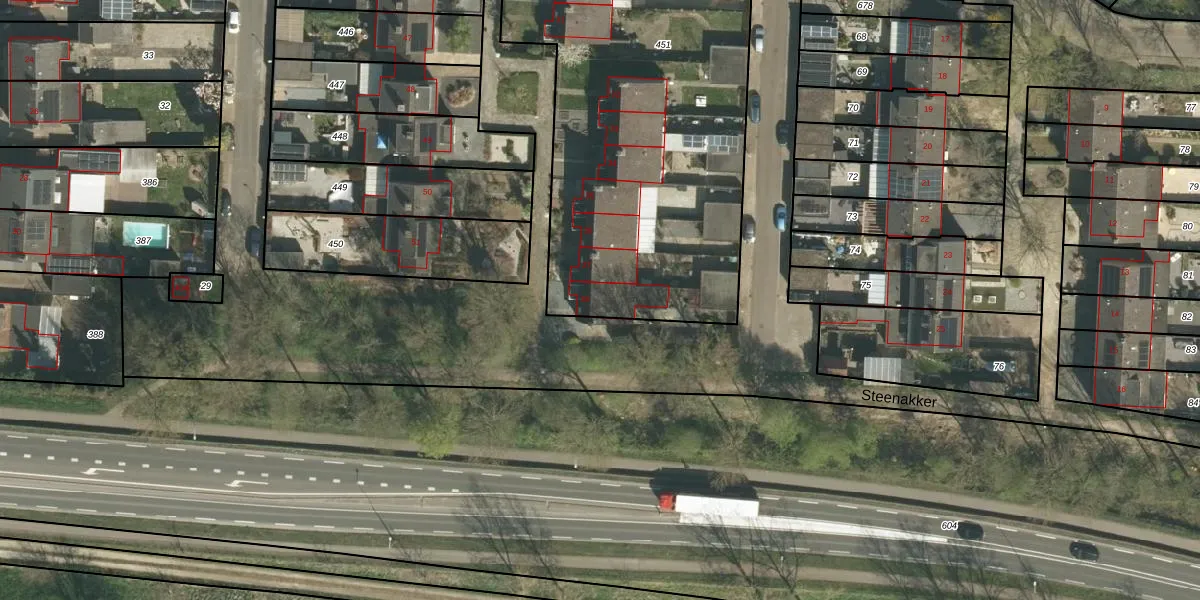Het perceel waarop Steenakker 38 staat heeft een oppervlakte van 2963 m². Dit is een zeer groot perceel. De perceeloppervlakte wordt geregistreerd door het Kadaster. Gedetailleerde informatie over de maten van dit perceel kunt u vinden in het rapport Kadastrale kaart met maatvoering van Steenakker 38.