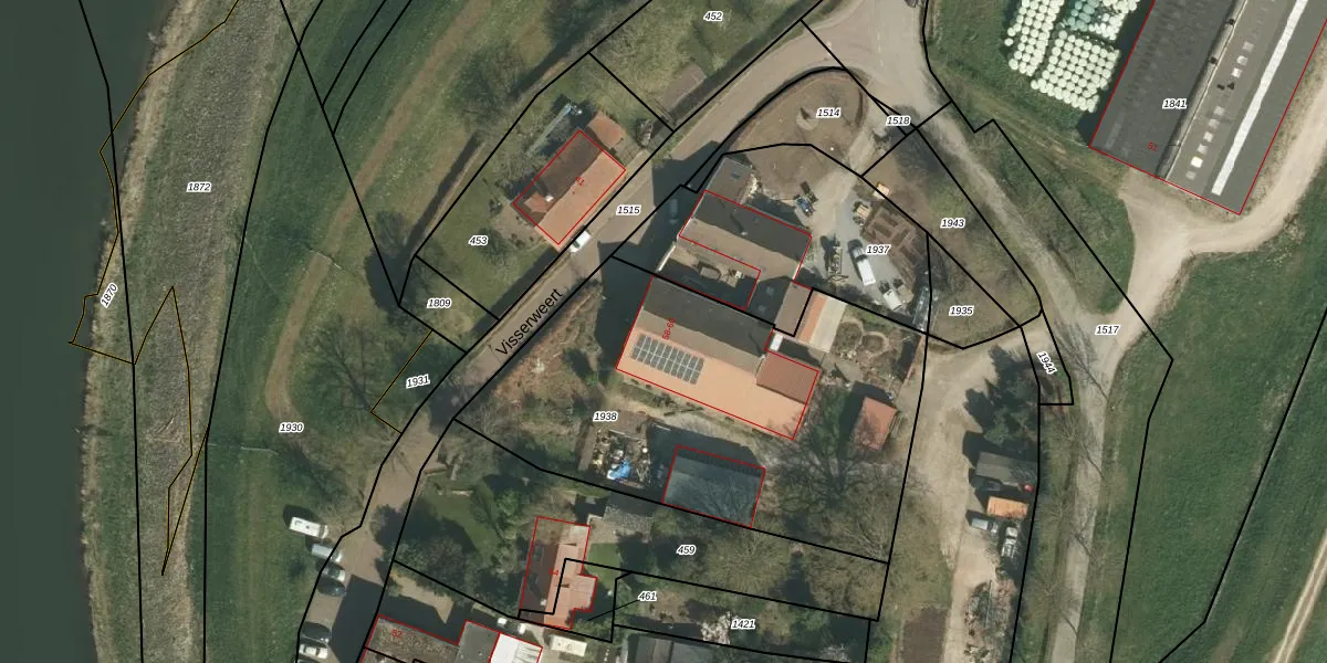 Het perceel waarop Visserweert 58 staat heeft een oppervlakte van 1975 m². Dit is een zeer groot perceel. De perceeloppervlakte wordt geregistreerd door het Kadaster. Gedetailleerde informatie over de maten van dit perceel kunt u vinden in het rapport Kadastrale kaart met maatvoering van Visserweert 58.