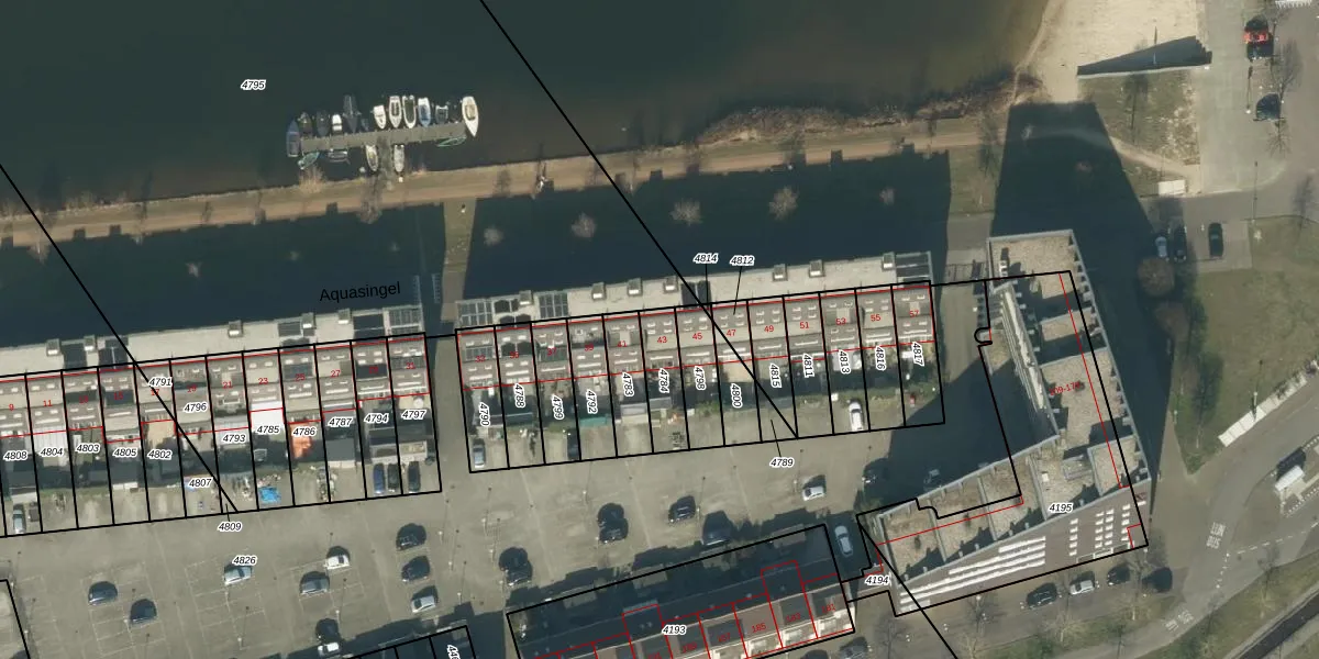 Aquasingel 43 is gelegen op kadastraal perceel RML00I4784. Deze kadastrale aanduiding is uniek en wordt gebruikt door het Kadaster om eigendomsrechten en andere zakelijke rechten vast te leggen. Het perceel maakt onderdeel uit van de kadastrale gemeente Rosmalen.