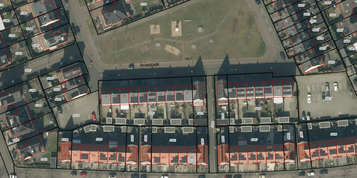 Het perceel waarop Ariastraat 25 staat heeft een oppervlakte van 1400 m². Dit is een zeer groot perceel. De perceeloppervlakte wordt geregistreerd door het Kadaster. Gedetailleerde informatie over de maten van dit perceel kunt u vinden in het rapport Kadastrale kaart met maatvoering van Ariastraat 25.
