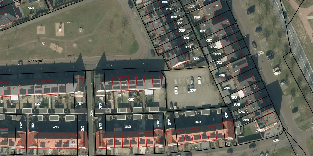 Het perceel waarop Ariastraat 45 staat heeft een oppervlakte van 1095 m². Dit is een zeer groot perceel. De perceeloppervlakte wordt geregistreerd door het Kadaster. Gedetailleerde informatie over de maten van dit perceel kunt u vinden in het rapport Kadastrale kaart met maatvoering van Ariastraat 45.