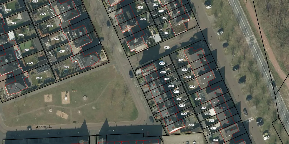 Het perceel waarop Ariastraat 63 staat heeft een oppervlakte van 181 m². Dit is een middelgroot perceel. De perceeloppervlakte wordt geregistreerd door het Kadaster. Gedetailleerde informatie over de maten van dit perceel kunt u vinden in het rapport Kadastrale kaart met maatvoering van Ariastraat 63.