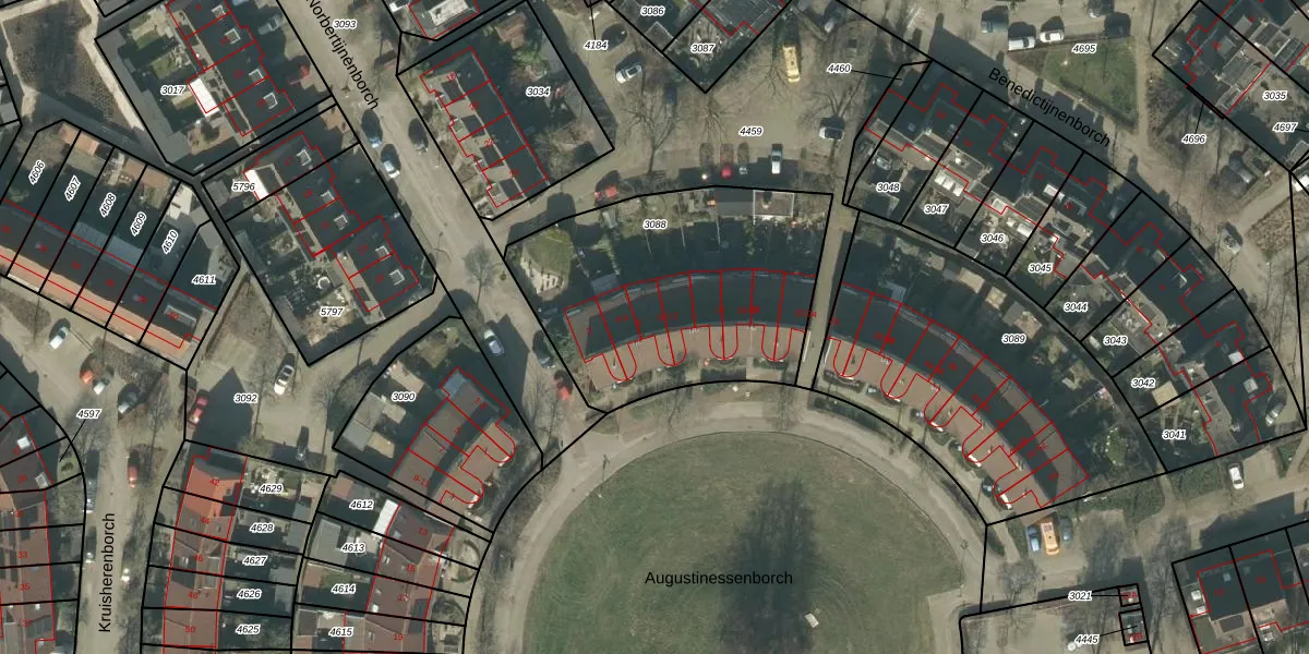 Het perceel waarop Augustinessenborch 8 staat heeft een oppervlakte van 1247 m². Dit is een zeer groot perceel. De perceeloppervlakte wordt geregistreerd door het Kadaster. Gedetailleerde informatie over de maten van dit perceel kunt u vinden in het rapport Kadastrale kaart met maatvoering van Augustinessenborch 8.