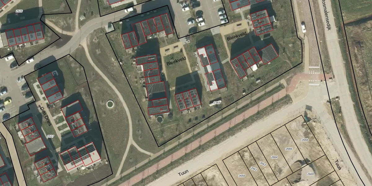 Het perceel waarop Bleekveld 27 staat heeft een oppervlakte van 5305 m². Dit is een zeer groot perceel. De perceeloppervlakte wordt geregistreerd door het Kadaster. Gedetailleerde informatie over de maten van dit perceel kunt u vinden in het rapport Kadastrale kaart met maatvoering van Bleekveld 27.