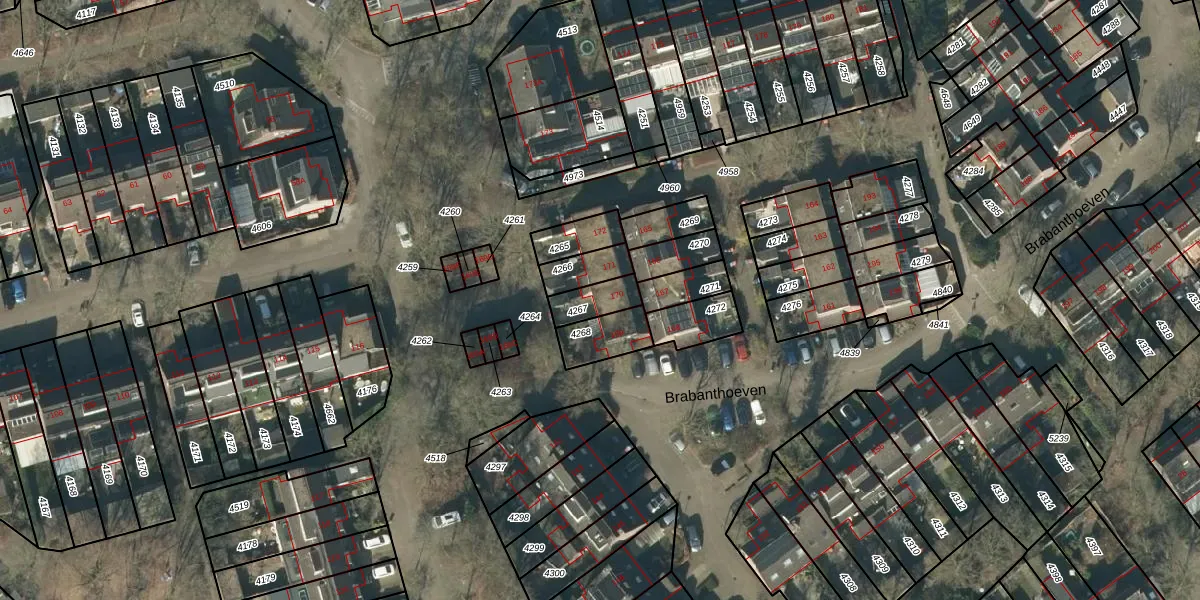 Het perceel waarop Brabanthoeven 170 staat heeft een oppervlakte van 81 m². Dit is een klein perceel. De perceeloppervlakte wordt geregistreerd door het Kadaster. Gedetailleerde informatie over de maten van dit perceel kunt u vinden in het rapport Kadastrale kaart met maatvoering van Brabanthoeven 170.