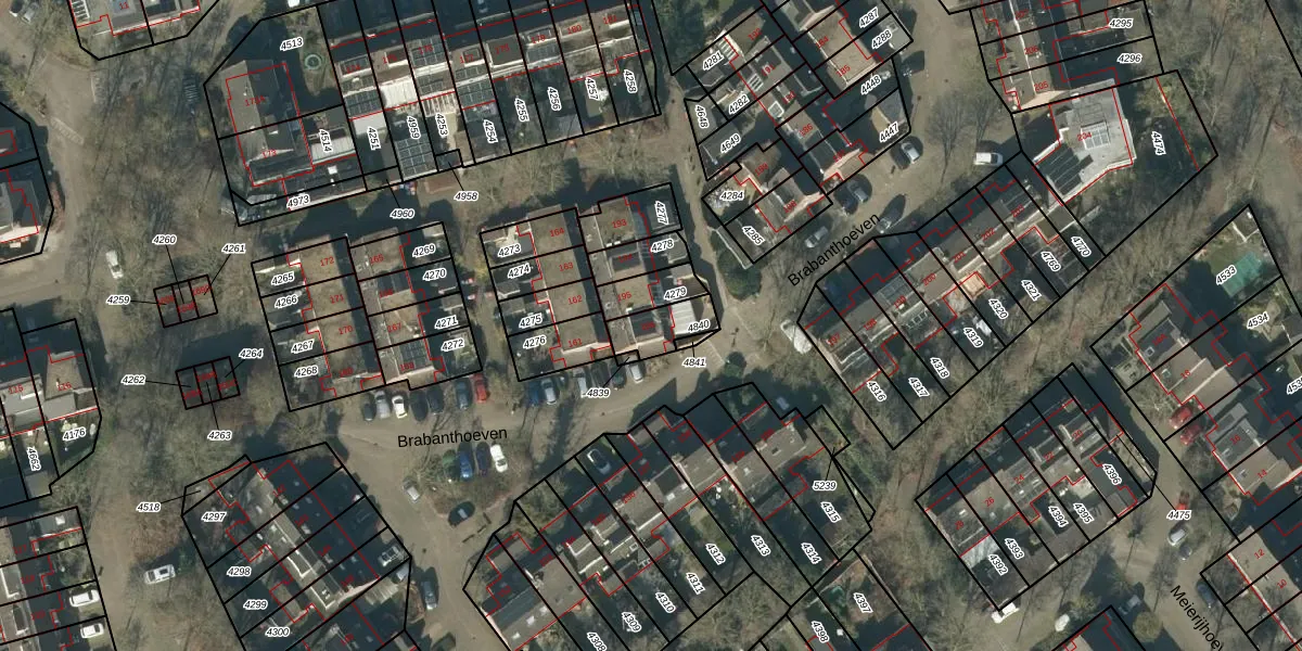 Het perceel waarop Brabanthoeven 196 staat heeft een oppervlakte van 102 m². Dit is een middelgroot perceel. De perceeloppervlakte wordt geregistreerd door het Kadaster. Gedetailleerde informatie over de maten van dit perceel kunt u vinden in het rapport Kadastrale kaart met maatvoering van Brabanthoeven 196.