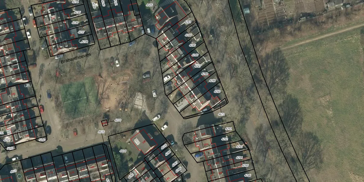 Het perceel waarop Brabanthoeven 213 staat heeft een oppervlakte van 172 m². Dit is een middelgroot perceel. De perceeloppervlakte wordt geregistreerd door het Kadaster. Gedetailleerde informatie over de maten van dit perceel kunt u vinden in het rapport Kadastrale kaart met maatvoering van Brabanthoeven 213.