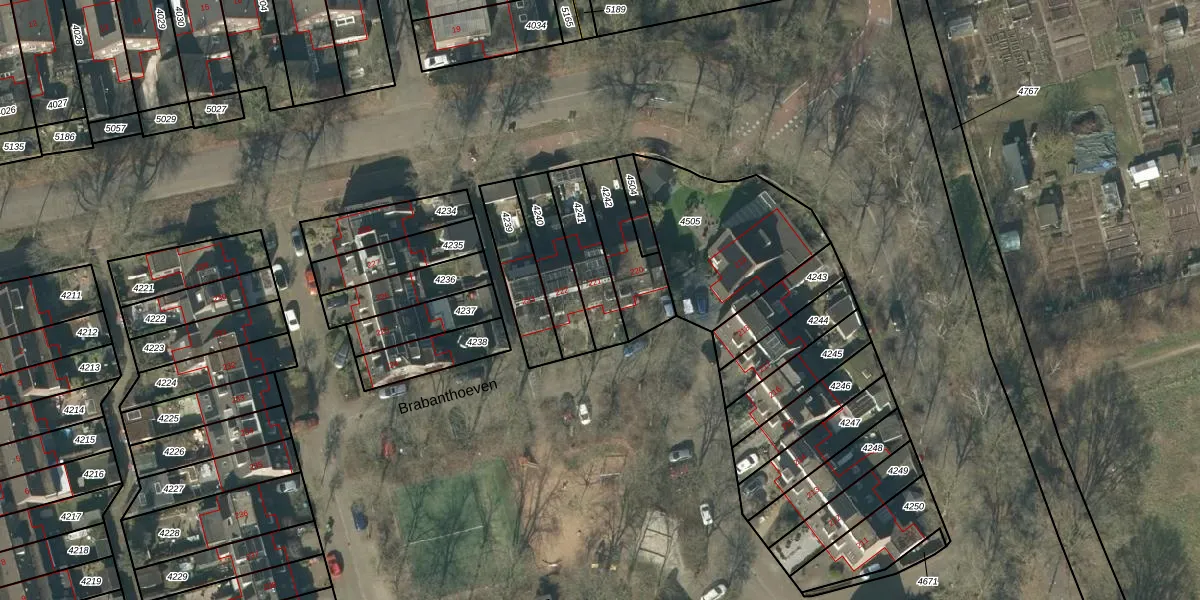 Het perceel waarop Brabanthoeven 221 staat heeft een oppervlakte van 175 m². Dit is een middelgroot perceel. De perceeloppervlakte wordt geregistreerd door het Kadaster. Gedetailleerde informatie over de maten van dit perceel kunt u vinden in het rapport Kadastrale kaart met maatvoering van Brabanthoeven 221.