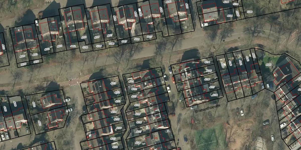 Het perceel waarop Brabanthoeven 229 staat heeft een oppervlakte van 185 m². Dit is een middelgroot perceel. De perceeloppervlakte wordt geregistreerd door het Kadaster. Gedetailleerde informatie over de maten van dit perceel kunt u vinden in het rapport Kadastrale kaart met maatvoering van Brabanthoeven 229.