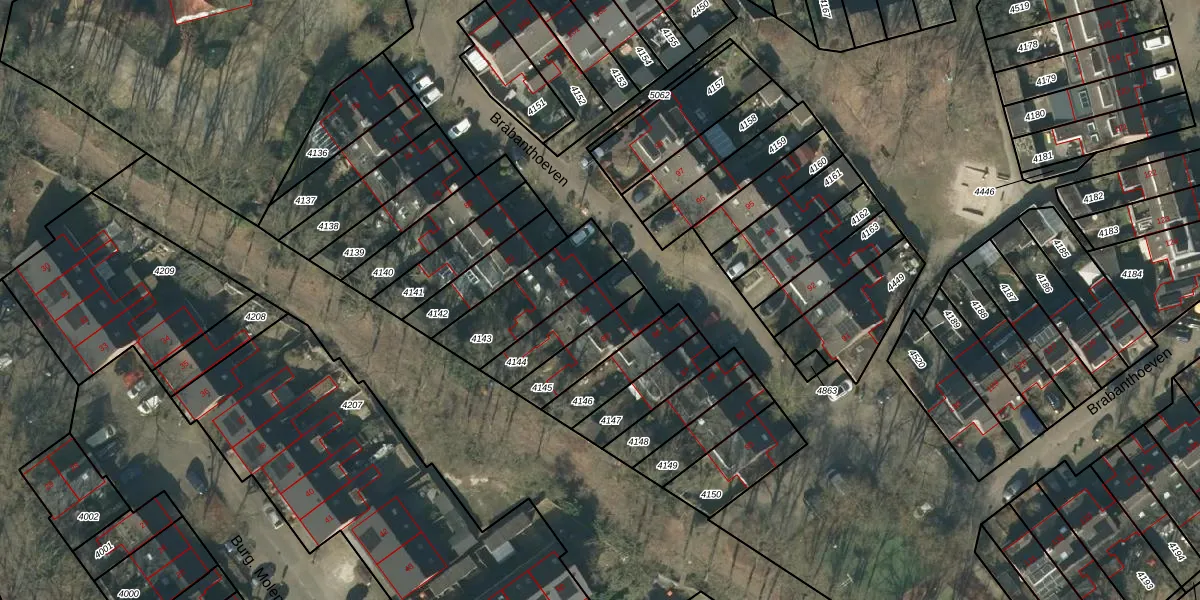 Het perceel waarop Brabanthoeven 84 staat heeft een oppervlakte van 166 m². Dit is een middelgroot perceel. De perceeloppervlakte wordt geregistreerd door het Kadaster. Gedetailleerde informatie over de maten van dit perceel kunt u vinden in het rapport Kadastrale kaart met maatvoering van Brabanthoeven 84.