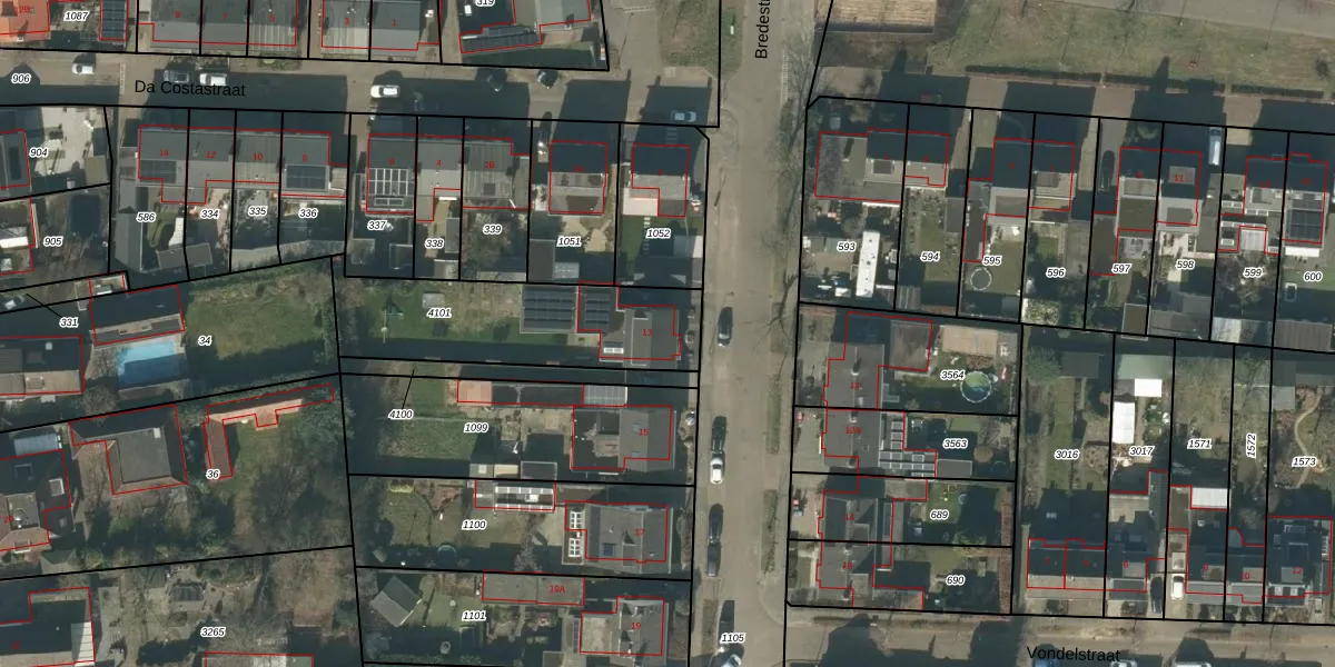 Het perceel waarop Bredestraat 13 staat heeft een oppervlakte van 697 m². Dit is een groot perceel. De perceeloppervlakte wordt geregistreerd door het Kadaster. Gedetailleerde informatie over de maten van dit perceel kunt u vinden in het rapport Kadastrale kaart met maatvoering van Bredestraat 13.