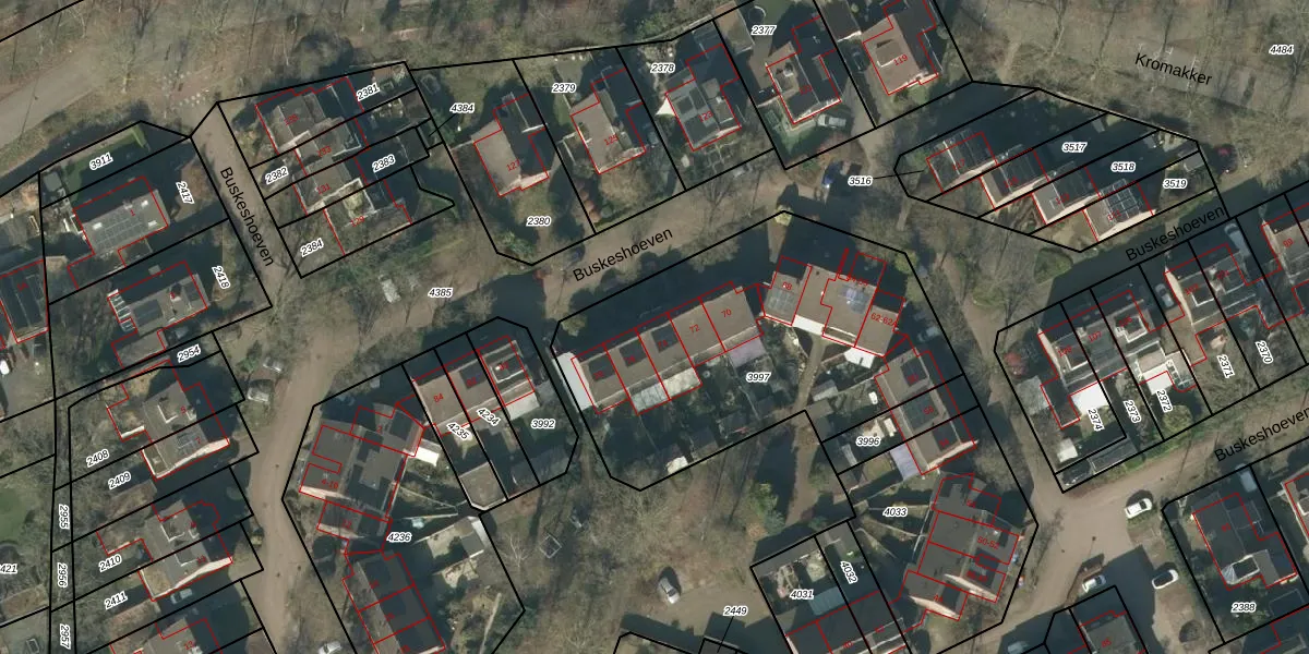 Het perceel waarop Buskeshoeven 74 staat heeft een oppervlakte van 1618 m². Dit is een zeer groot perceel. De perceeloppervlakte wordt geregistreerd door het Kadaster. Gedetailleerde informatie over de maten van dit perceel kunt u vinden in het rapport Kadastrale kaart met maatvoering van Buskeshoeven 74.