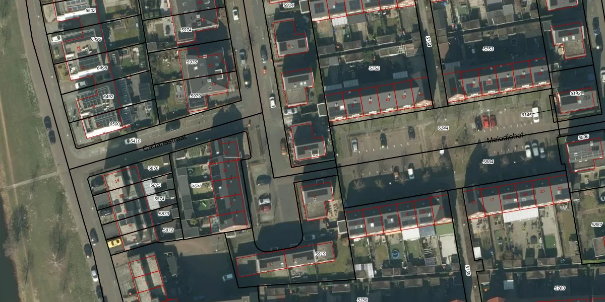 Het perceel waarop Cadansstraat 5 staat heeft een oppervlakte van 1005 m². Dit is een zeer groot perceel. De perceeloppervlakte wordt geregistreerd door het Kadaster. Gedetailleerde informatie over de maten van dit perceel kunt u vinden in het rapport Kadastrale kaart met maatvoering van Cadansstraat 5.