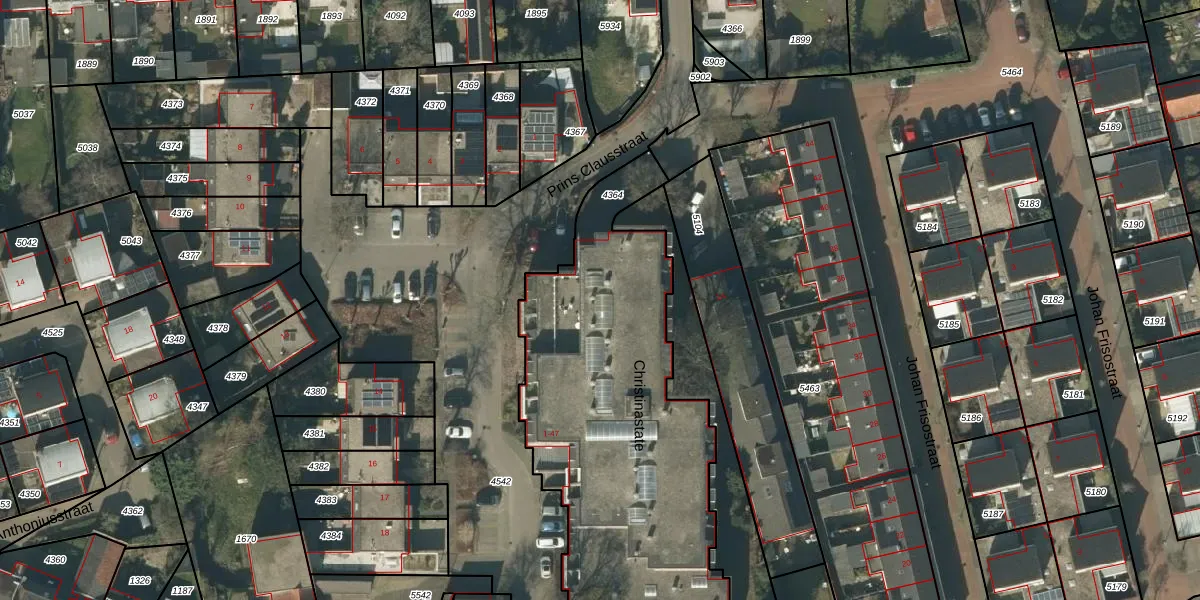 Het perceel waarop Christinastate 12 staat heeft een oppervlakte van 1842 m². Dit is een zeer groot perceel. De perceeloppervlakte wordt geregistreerd door het Kadaster. Gedetailleerde informatie over de maten van dit perceel kunt u vinden in het rapport Kadastrale kaart met maatvoering van Christinastate 12.