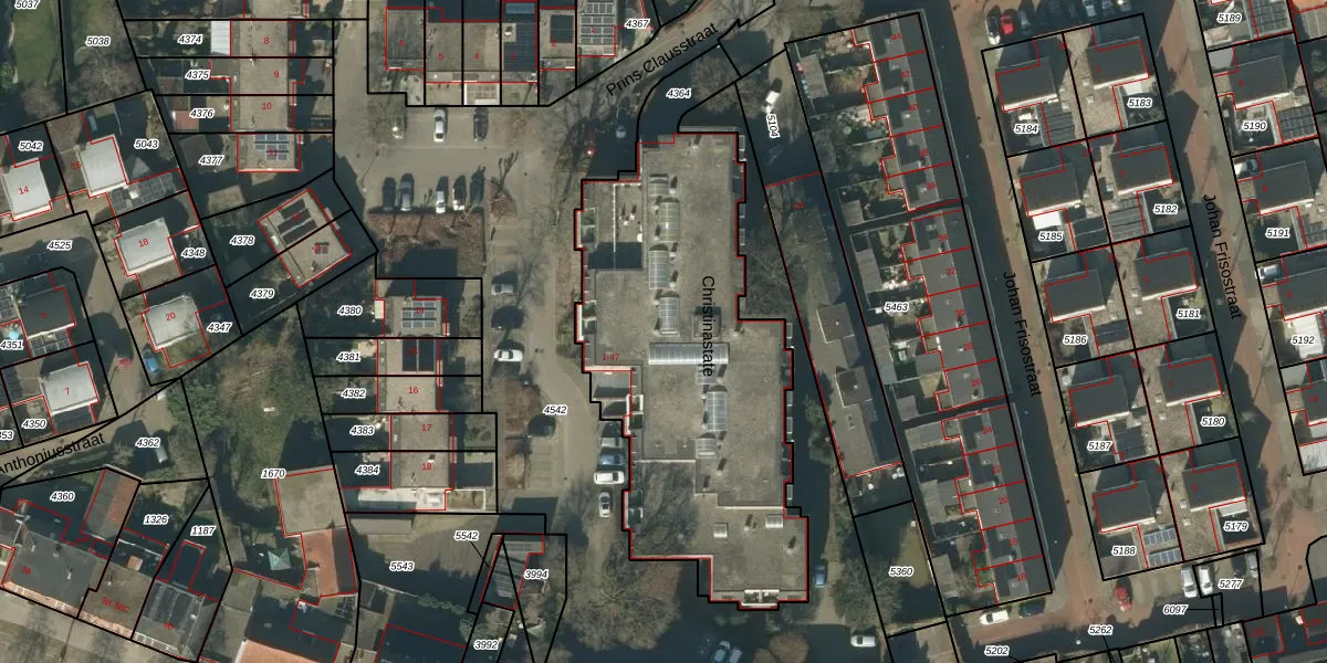 Het perceel waarop Christinastate 15 staat heeft een oppervlakte van 1842 m². Dit is een zeer groot perceel. De perceeloppervlakte wordt geregistreerd door het Kadaster. Gedetailleerde informatie over de maten van dit perceel kunt u vinden in het rapport Kadastrale kaart met maatvoering van Christinastate 15.
