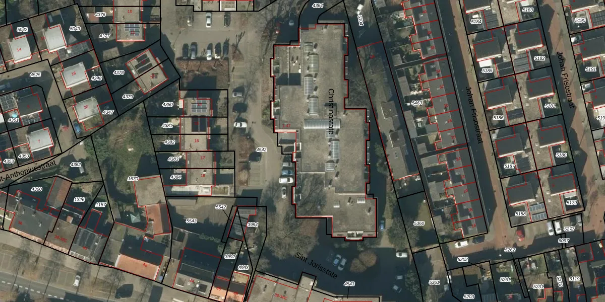 Het perceel waarop Christinastate 7 staat heeft een oppervlakte van 1842 m². Dit is een zeer groot perceel. De perceeloppervlakte wordt geregistreerd door het Kadaster. Gedetailleerde informatie over de maten van dit perceel kunt u vinden in het rapport Kadastrale kaart met maatvoering van Christinastate 7.