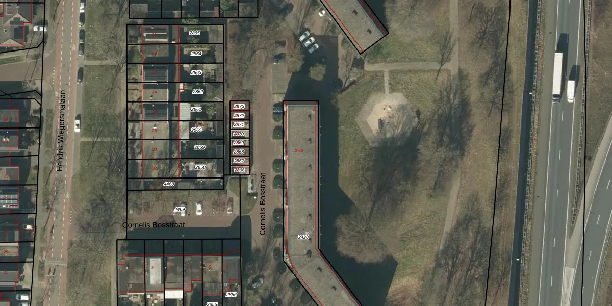 Het perceel waarop Cornelis Bosstraat 30 staat heeft een oppervlakte van 975 m². Dit is een groot perceel. De perceeloppervlakte wordt geregistreerd door het Kadaster. Gedetailleerde informatie over de maten van dit perceel kunt u vinden in het rapport Kadastrale kaart met maatvoering van Cornelis Bosstraat 30.
