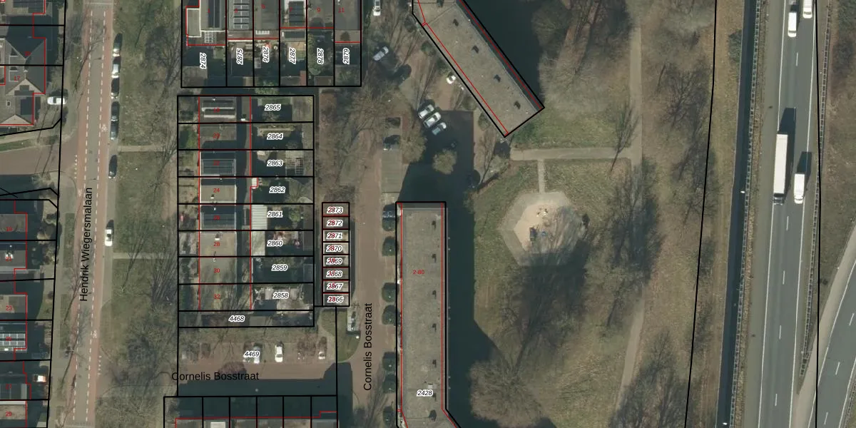 Het perceel waarop Cornelis Bosstraat 6 staat heeft een oppervlakte van 975 m². Dit is een groot perceel. De perceeloppervlakte wordt geregistreerd door het Kadaster. Gedetailleerde informatie over de maten van dit perceel kunt u vinden in het rapport Kadastrale kaart met maatvoering van Cornelis Bosstraat 6.