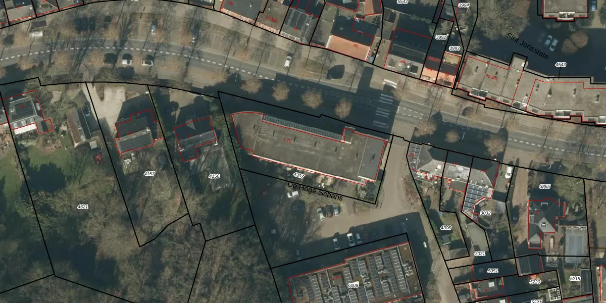 Het perceel waarop De Hoge Schans 15 staat heeft een oppervlakte van 1220 m². Dit is een zeer groot perceel. De perceeloppervlakte wordt geregistreerd door het Kadaster. Gedetailleerde informatie over de maten van dit perceel kunt u vinden in het rapport Kadastrale kaart met maatvoering van De Hoge Schans 15.