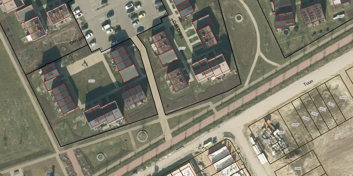 Het perceel waarop Den Dries 12 staat heeft een oppervlakte van 2895 m². Dit is een zeer groot perceel. De perceeloppervlakte wordt geregistreerd door het Kadaster. Gedetailleerde informatie over de maten van dit perceel kunt u vinden in het rapport Kadastrale kaart met maatvoering van Den Dries 12.