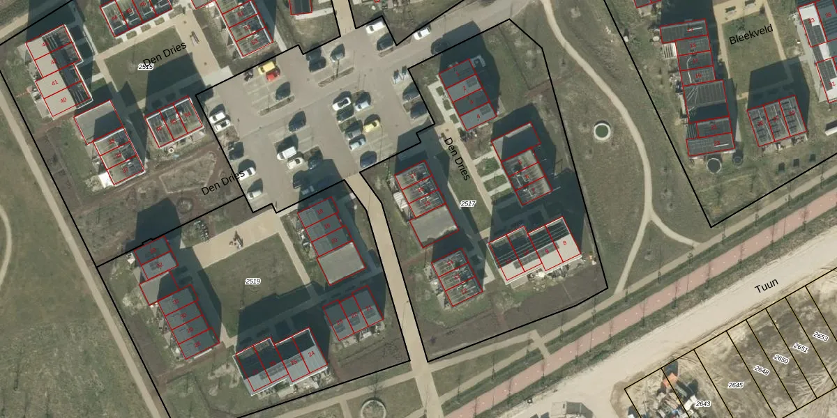 Het perceel waarop Den Dries 15 staat heeft een oppervlakte van 2895 m². Dit is een zeer groot perceel. De perceeloppervlakte wordt geregistreerd door het Kadaster. Gedetailleerde informatie over de maten van dit perceel kunt u vinden in het rapport Kadastrale kaart met maatvoering van Den Dries 15.