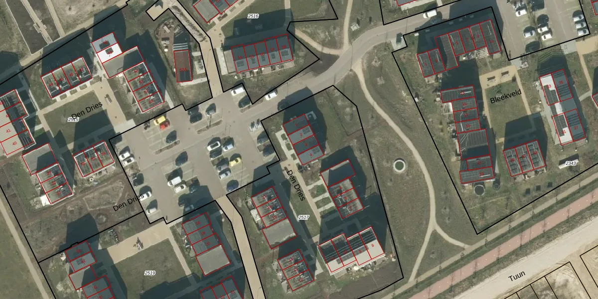 Het perceel waarop Den Dries 3 staat heeft een oppervlakte van 2895 m². Dit is een zeer groot perceel. De perceeloppervlakte wordt geregistreerd door het Kadaster. Gedetailleerde informatie over de maten van dit perceel kunt u vinden in het rapport Kadastrale kaart met maatvoering van Den Dries 3.