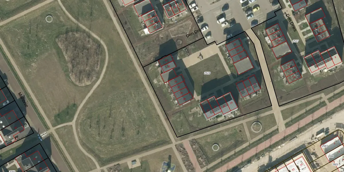 Het perceel waarop Den Dries 31 staat heeft een oppervlakte van 2875 m². Dit is een zeer groot perceel. De perceeloppervlakte wordt geregistreerd door het Kadaster. Gedetailleerde informatie over de maten van dit perceel kunt u vinden in het rapport Kadastrale kaart met maatvoering van Den Dries 31.