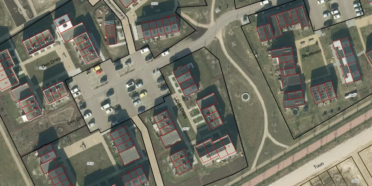 Het perceel waarop Den Dries 4 staat heeft een oppervlakte van 2895 m². Dit is een zeer groot perceel. De perceeloppervlakte wordt geregistreerd door het Kadaster. Gedetailleerde informatie over de maten van dit perceel kunt u vinden in het rapport Kadastrale kaart met maatvoering van Den Dries 4.