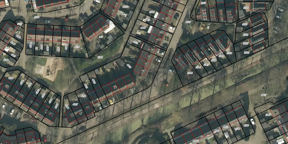 Het perceel waarop Dommelborch 77 staat heeft een oppervlakte van 1150 m². Dit is een zeer groot perceel. De perceeloppervlakte wordt geregistreerd door het Kadaster. Gedetailleerde informatie over de maten van dit perceel kunt u vinden in het rapport Kadastrale kaart met maatvoering van Dommelborch 77.