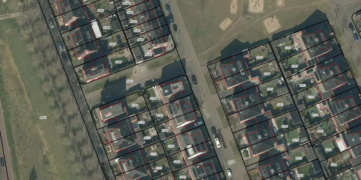 Het perceel waarop Duetstraat 28 staat heeft een oppervlakte van 301 m². Dit is een groot perceel. De perceeloppervlakte wordt geregistreerd door het Kadaster. Gedetailleerde informatie over de maten van dit perceel kunt u vinden in het rapport Kadastrale kaart met maatvoering van Duetstraat 28.