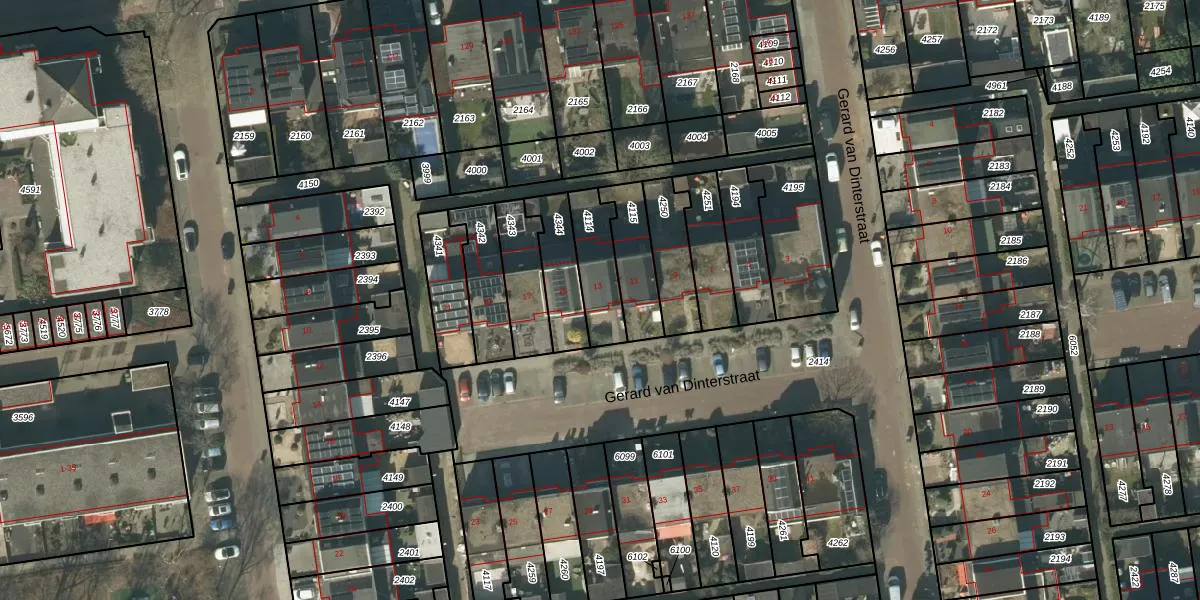 Het perceel waarop Gerard van Dinterstraat 13 staat heeft een oppervlakte van 165 m². Dit is een middelgroot perceel. De perceeloppervlakte wordt geregistreerd door het Kadaster. Gedetailleerde informatie over de maten van dit perceel kunt u vinden in het rapport Kadastrale kaart met maatvoering van Gerard van Dinterstraat 13.