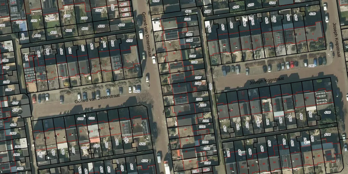 Het perceel waarop Gerard van Dinterstraat 16 staat heeft een oppervlakte van 163 m². Dit is een middelgroot perceel. De perceeloppervlakte wordt geregistreerd door het Kadaster. Gedetailleerde informatie over de maten van dit perceel kunt u vinden in het rapport Kadastrale kaart met maatvoering van Gerard van Dinterstraat 16.