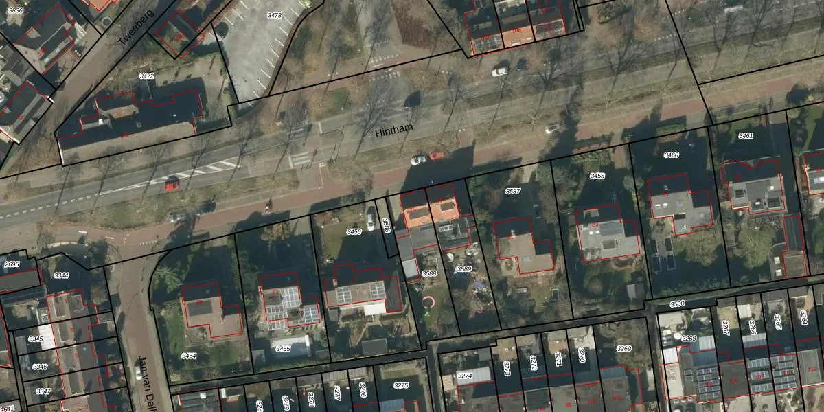 Het perceel waarop Hintham 75 staat heeft een oppervlakte van 372 m². Dit is een groot perceel. De perceeloppervlakte wordt geregistreerd door het Kadaster. Gedetailleerde informatie over de maten van dit perceel kunt u vinden in het rapport Kadastrale kaart met maatvoering van Hintham 75.