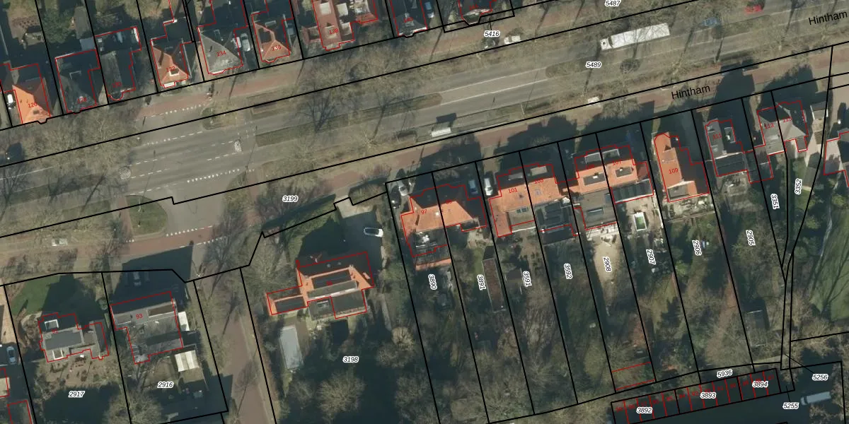 Het perceel waarop Hintham 97 staat heeft een oppervlakte van 704 m². Dit is een groot perceel. De perceeloppervlakte wordt geregistreerd door het Kadaster. Gedetailleerde informatie over de maten van dit perceel kunt u vinden in het rapport Kadastrale kaart met maatvoering van Hintham 97.