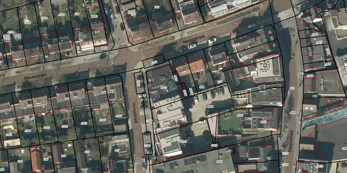 Het perceel waarop Hoogstraat 66-G staat heeft een oppervlakte van 380 m². Dit is een groot perceel. De perceeloppervlakte wordt geregistreerd door het Kadaster. Gedetailleerde informatie over de maten van dit perceel kunt u vinden in het rapport Kadastrale kaart met maatvoering van Hoogstraat 66-G.