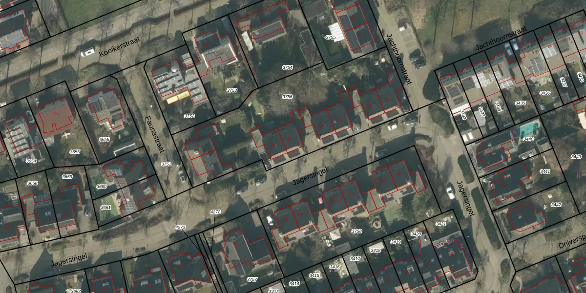 Het perceel waarop Jagersingel 41 staat heeft een oppervlakte van 1879 m². Dit is een zeer groot perceel. De perceeloppervlakte wordt geregistreerd door het Kadaster. Gedetailleerde informatie over de maten van dit perceel kunt u vinden in het rapport Kadastrale kaart met maatvoering van Jagersingel 41.