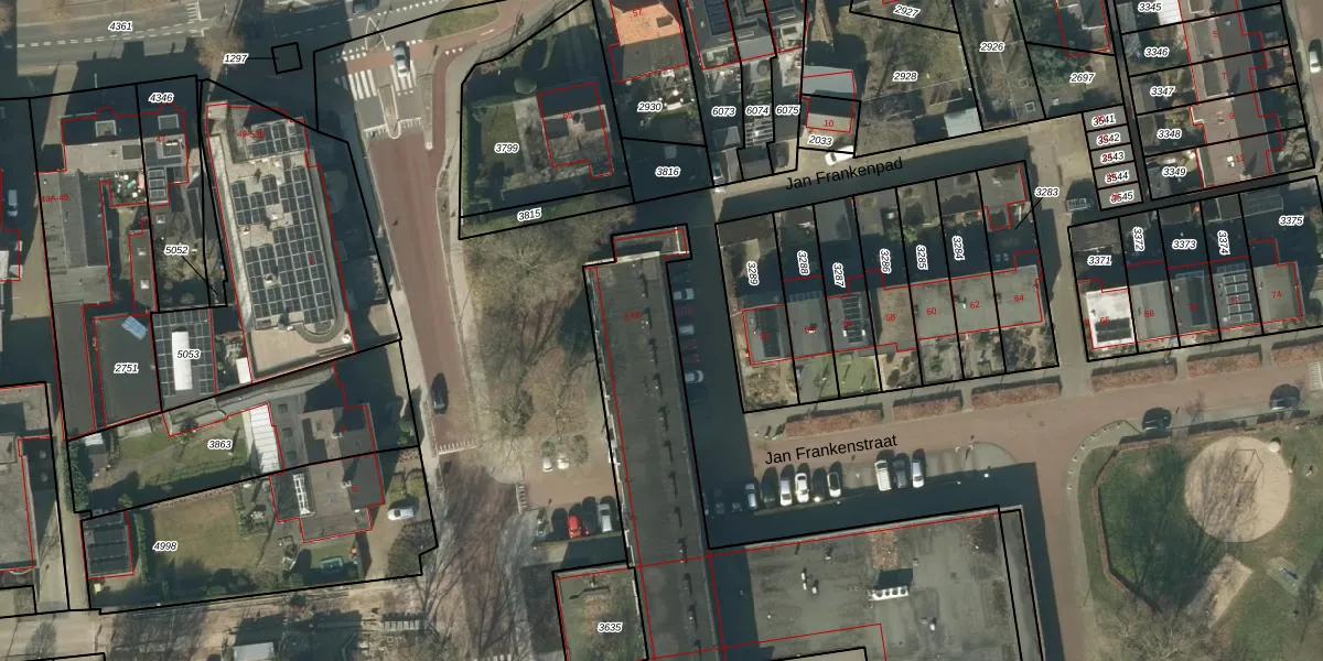 Het perceel waarop Jan Frankenstraat 46 staat heeft een oppervlakte van 4670 m². Dit is een zeer groot perceel. De perceeloppervlakte wordt geregistreerd door het Kadaster. Gedetailleerde informatie over de maten van dit perceel kunt u vinden in het rapport Kadastrale kaart met maatvoering van Jan Frankenstraat 46.