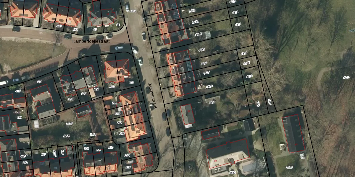 Het perceel waarop Jasmijnstraat 32 staat heeft een oppervlakte van 422 m². Dit is een groot perceel. De perceeloppervlakte wordt geregistreerd door het Kadaster. Gedetailleerde informatie over de maten van dit perceel kunt u vinden in het rapport Kadastrale kaart met maatvoering van Jasmijnstraat 32.