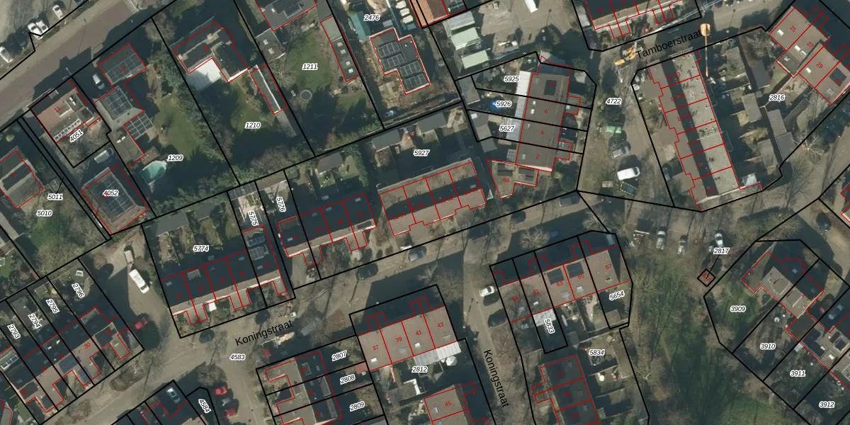Het perceel waarop Koningstraat 56 staat heeft een oppervlakte van 1580 m². Dit is een zeer groot perceel. De perceeloppervlakte wordt geregistreerd door het Kadaster. Gedetailleerde informatie over de maten van dit perceel kunt u vinden in het rapport Kadastrale kaart met maatvoering van Koningstraat 56.