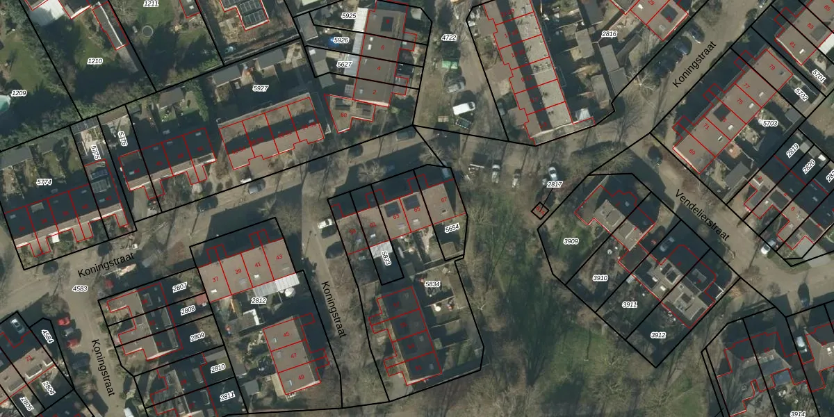 Het perceel waarop Koningstraat 65 staat heeft een oppervlakte van 1081 m². Dit is een zeer groot perceel. De perceeloppervlakte wordt geregistreerd door het Kadaster. Gedetailleerde informatie over de maten van dit perceel kunt u vinden in het rapport Kadastrale kaart met maatvoering van Koningstraat 65.