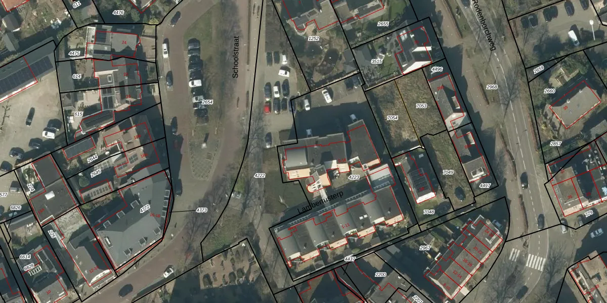 Het perceel waarop Lambertusterp 16 staat heeft een oppervlakte van 1955 m². Dit is een zeer groot perceel. De perceeloppervlakte wordt geregistreerd door het Kadaster. Gedetailleerde informatie over de maten van dit perceel kunt u vinden in het rapport Kadastrale kaart met maatvoering van Lambertusterp 16.