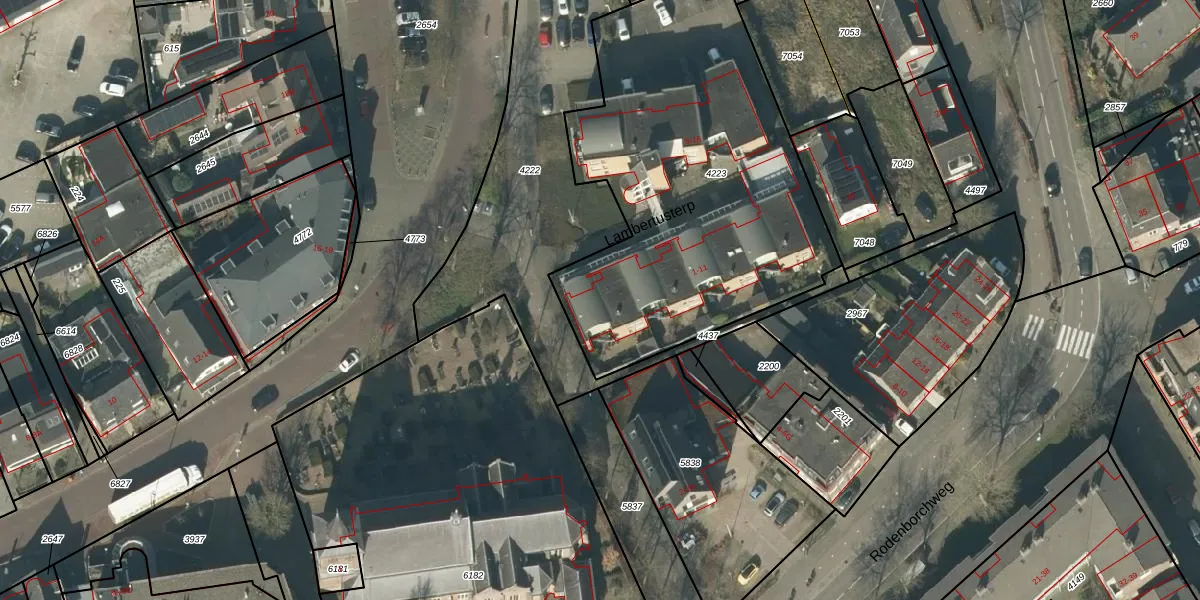 Het perceel waarop Lambertusterp 8 staat heeft een oppervlakte van 1955 m². Dit is een zeer groot perceel. De perceeloppervlakte wordt geregistreerd door het Kadaster. Gedetailleerde informatie over de maten van dit perceel kunt u vinden in het rapport Kadastrale kaart met maatvoering van Lambertusterp 8.
