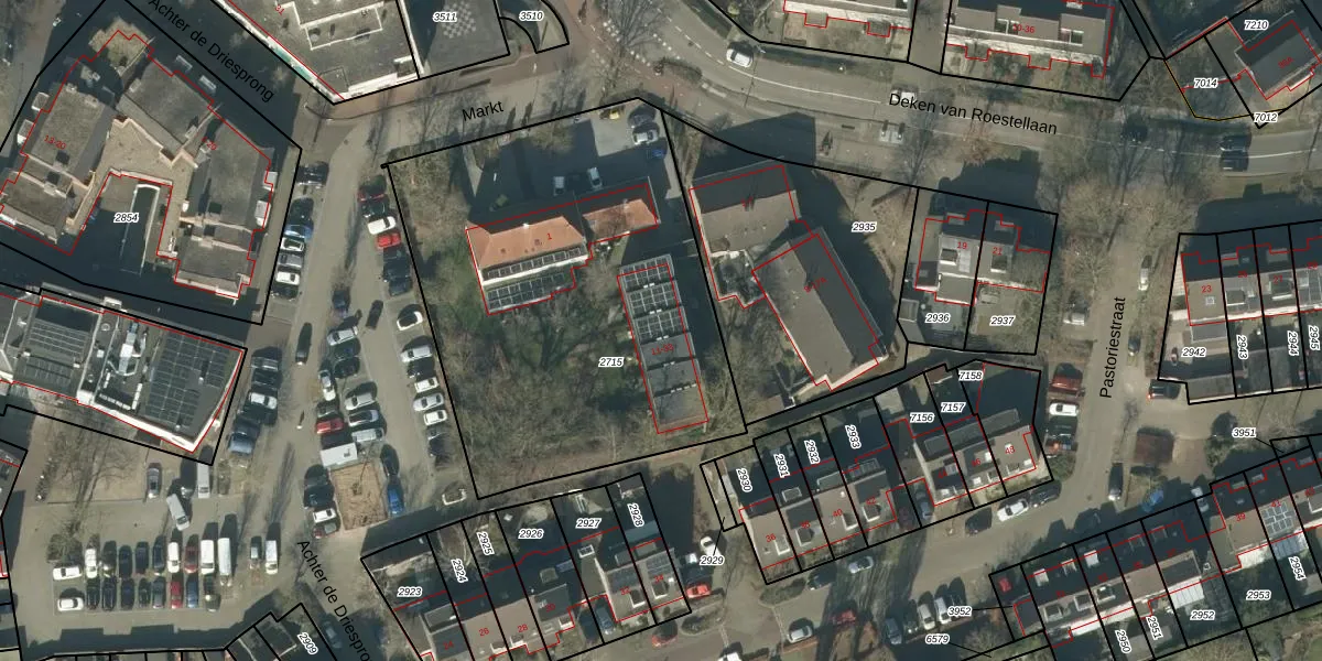 Het perceel waarop Markt 27 staat heeft een oppervlakte van 2222 m². Dit is een zeer groot perceel. De perceeloppervlakte wordt geregistreerd door het Kadaster. Gedetailleerde informatie over de maten van dit perceel kunt u vinden in het rapport Kadastrale kaart met maatvoering van Markt 27.