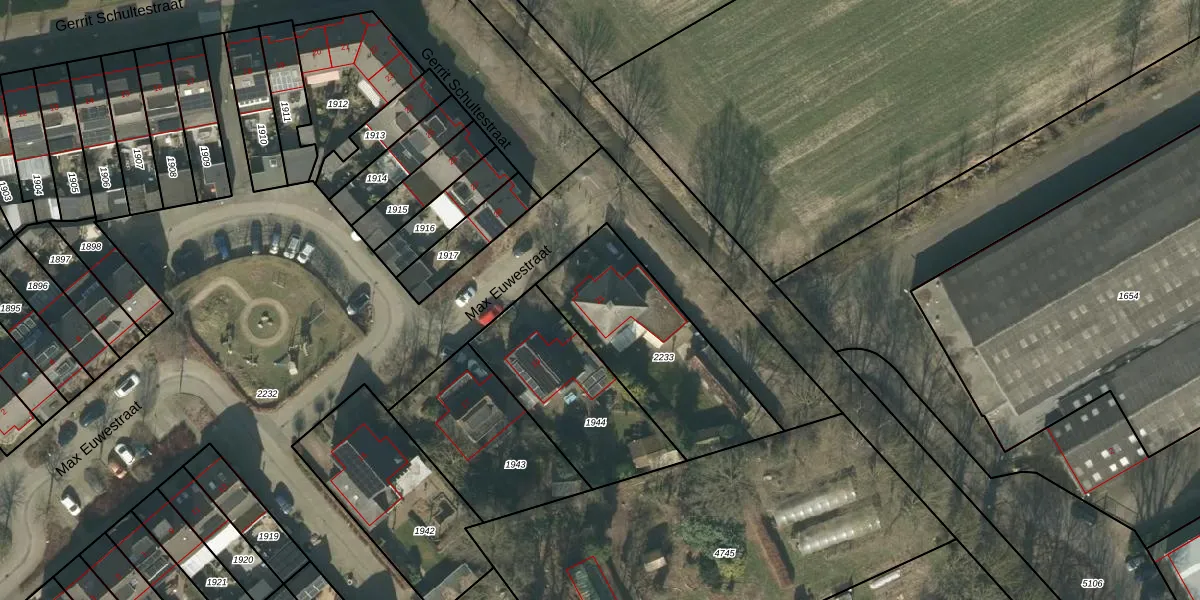 Het perceel waarop Max Euwestraat 21 staat heeft een oppervlakte van 654 m². Dit is een groot perceel. De perceeloppervlakte wordt geregistreerd door het Kadaster. Gedetailleerde informatie over de maten van dit perceel kunt u vinden in het rapport Kadastrale kaart met maatvoering van Max Euwestraat 21.