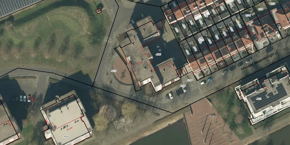 Meester Broerensingel 121 is gelegen op kadastraal perceel RML00E4545. Deze kadastrale aanduiding is uniek en wordt gebruikt door het Kadaster om eigendomsrechten en andere zakelijke rechten vast te leggen. Het perceel maakt onderdeel uit van de kadastrale gemeente Rosmalen.