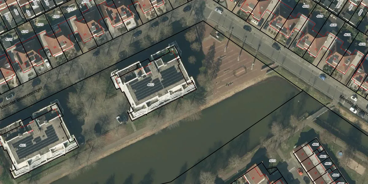 Het perceel waarop Meester Broerensingel 42 staat heeft een oppervlakte van 905 m². Dit is een groot perceel. De perceeloppervlakte wordt geregistreerd door het Kadaster. Gedetailleerde informatie over de maten van dit perceel kunt u vinden in het rapport Kadastrale kaart met maatvoering van Meester Broerensingel 42.