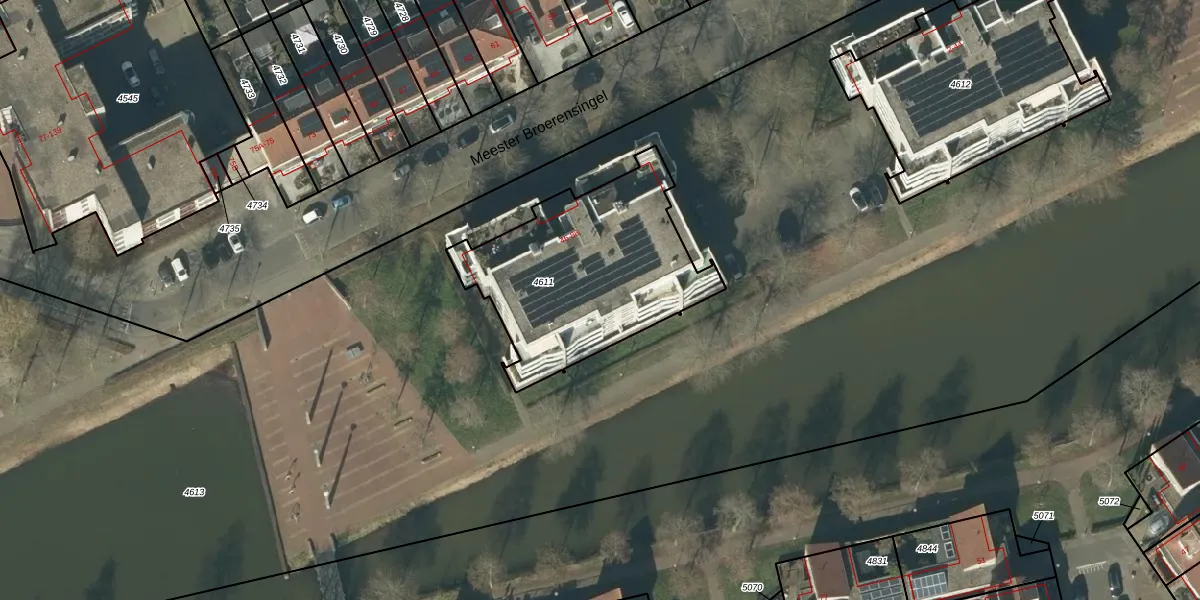 Het perceel waarop Meester Broerensingel 50 staat heeft een oppervlakte van 905 m². Dit is een groot perceel. De perceeloppervlakte wordt geregistreerd door het Kadaster. Gedetailleerde informatie over de maten van dit perceel kunt u vinden in het rapport Kadastrale kaart met maatvoering van Meester Broerensingel 50.
