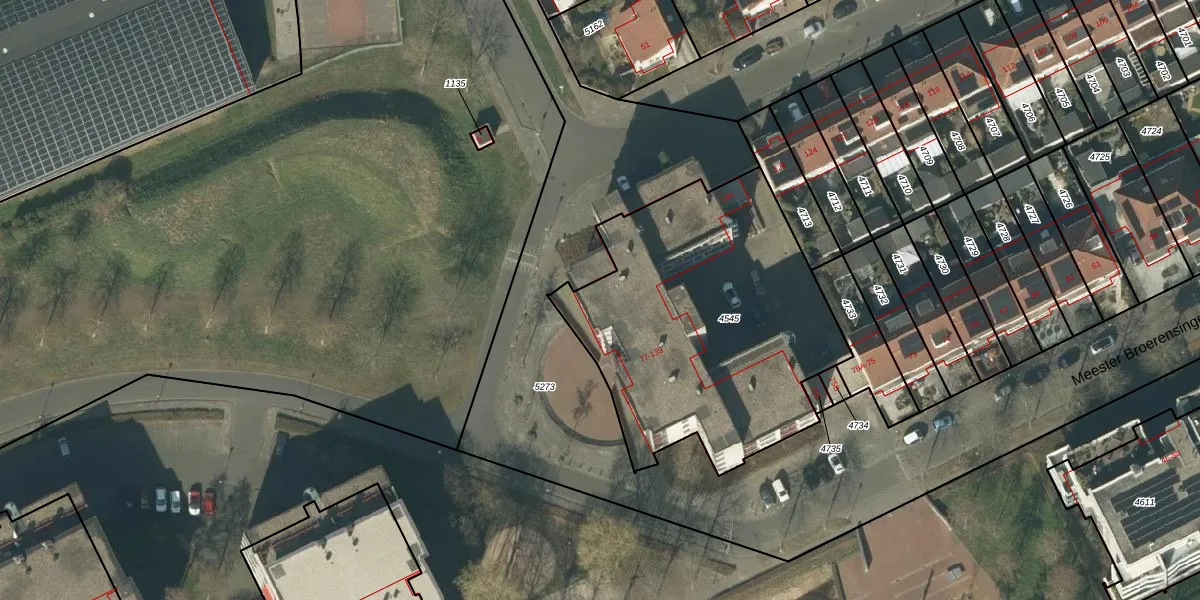 Het perceel waarop Meester Broerensingel 77 staat heeft een oppervlakte van 1553 m². Dit is een zeer groot perceel. De perceeloppervlakte wordt geregistreerd door het Kadaster. Gedetailleerde informatie over de maten van dit perceel kunt u vinden in het rapport Kadastrale kaart met maatvoering van Meester Broerensingel 77.