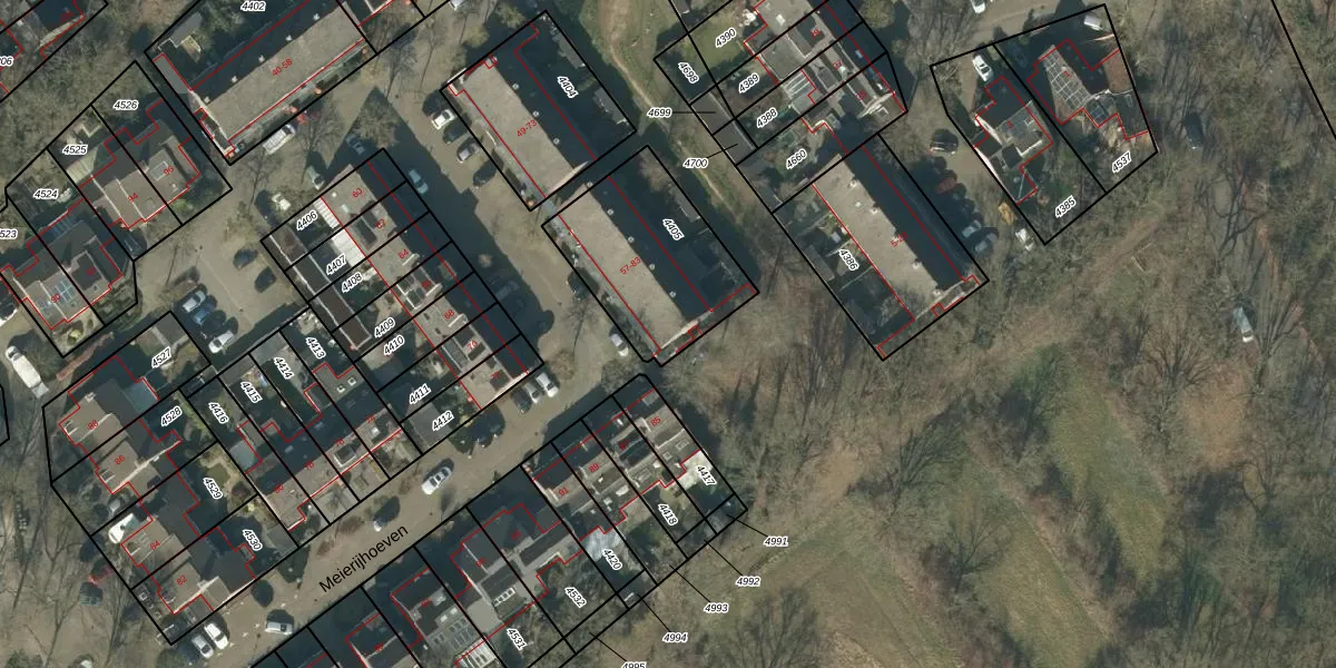 Het perceel waarop Meierijhoeven 65 staat heeft een oppervlakte van 547 m². Dit is een groot perceel. De perceeloppervlakte wordt geregistreerd door het Kadaster. Gedetailleerde informatie over de maten van dit perceel kunt u vinden in het rapport Kadastrale kaart met maatvoering van Meierijhoeven 65.